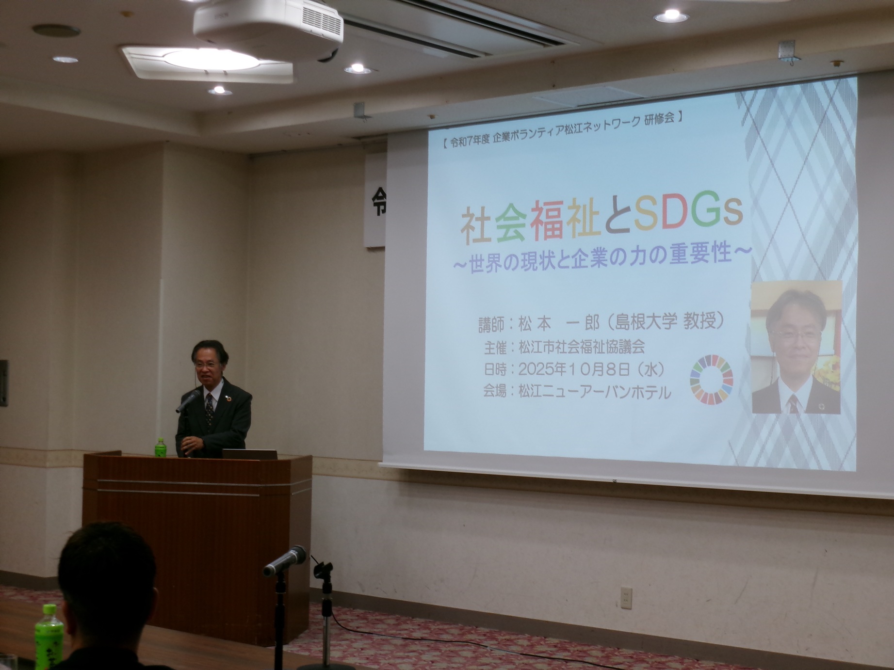 続く研修会では「社会福祉とSDGs~世界の現状と企業の力の重要性~」と題して、島根大学学術研究院教授松本一郎先生からご講演をいただき、改めてSDGsの概念と社会福祉との深いかかわりについて学びました。